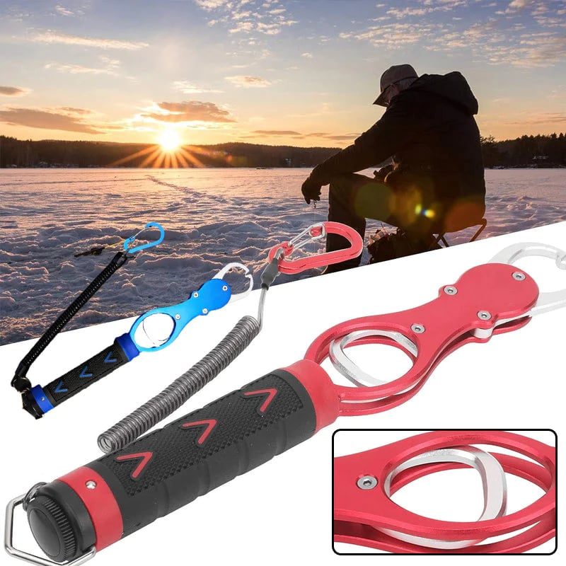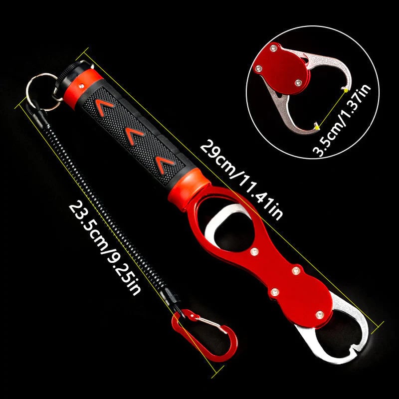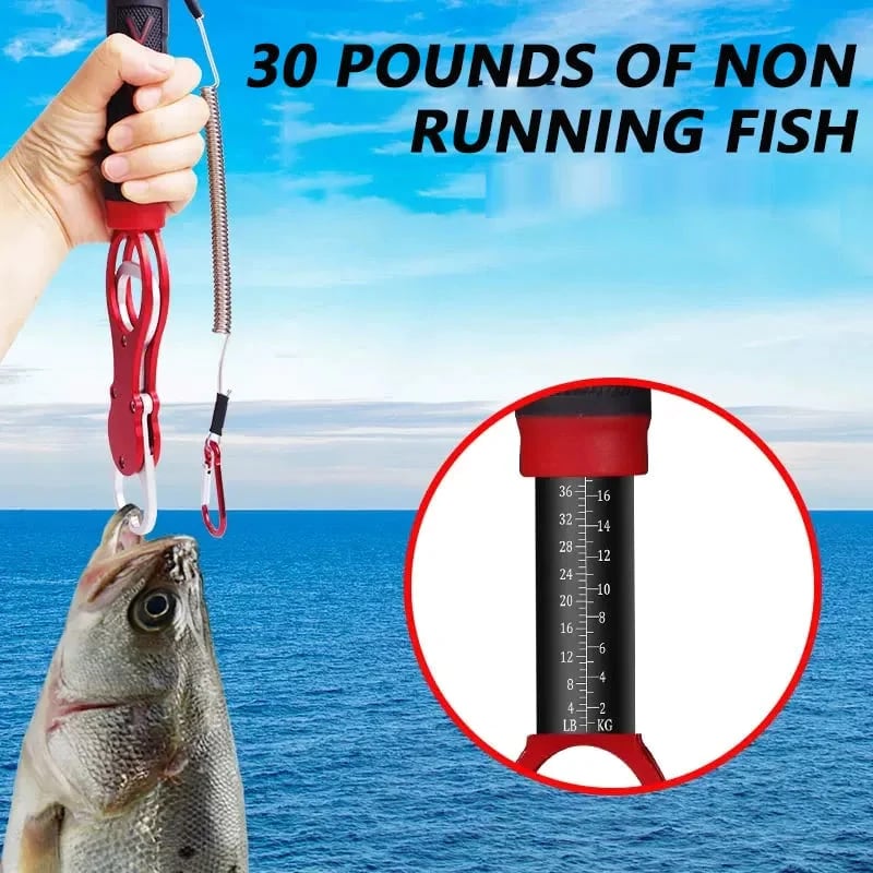 စကေးပါသော Fish Lip Gripper: ငါးဖမ်းကိရိယာတွင် ကြည်လင်ပြတ်သားစွာ ဖတ်ရှုနိုင်စေရန် အလေးချိန် ၃၉ ပေါင်အထိ တပ်ဆင်ထားသည့် ချိန်ခွင်တစ်ခုပါရှိသည်။