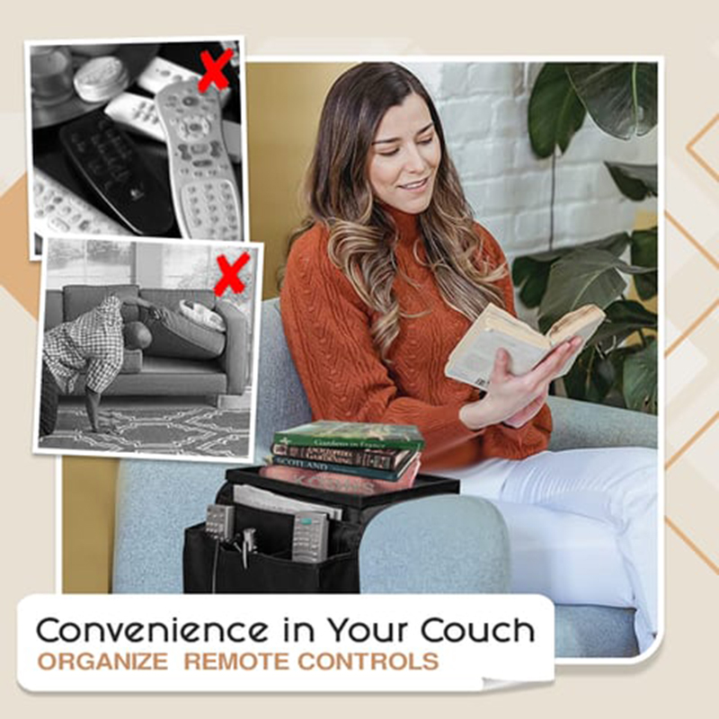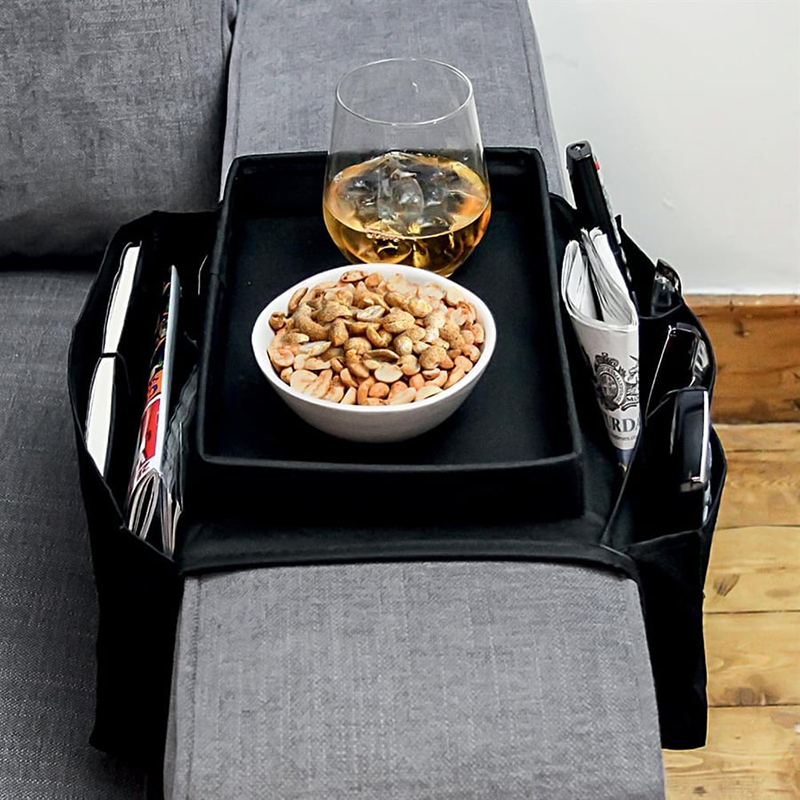 သင်၏ ဆိုဖာကို သန့်ရှင်းပြီး အဝေးမှ သွားလာနိုင်သော ထားပါ။ Sofa Armrest Tray with Organizer သည် အဝေးထိန်းထိန်းချုပ်မှု ဆုံးရှုံးပြီး သင့်အစာများ လက်လှမ်းမမီစေရန်