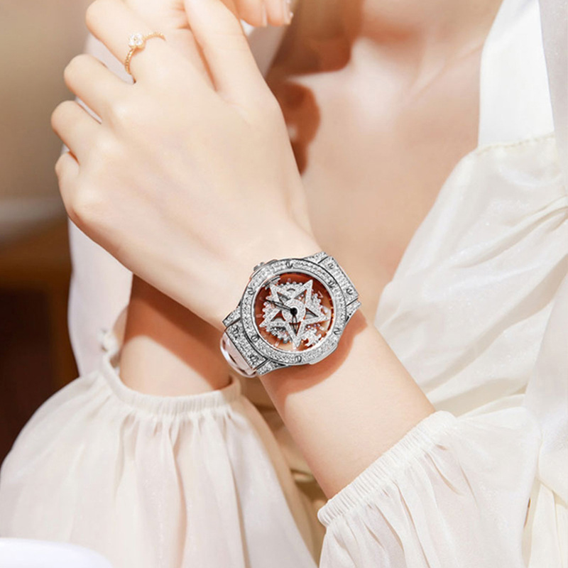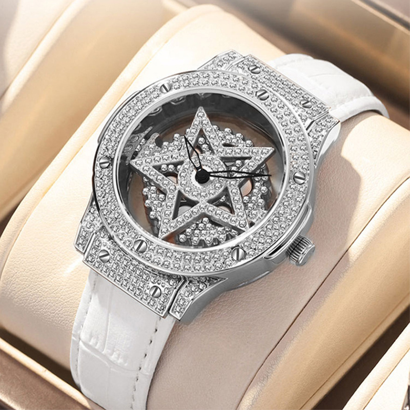 နာရီဝက်စောပြီးအမျိုးသမီး Diamond Quartz နာရီ Pentagram Full Diamond 360 Degree Rotating Ladies Watch