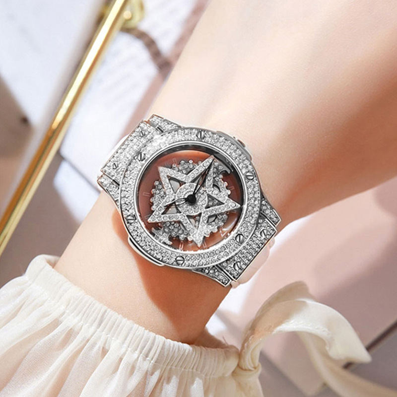 လွန်ခဲ့သော ၄ မိနစ်အမျိုးသမီး Diamond Quartz နာရီ Pentagram Full Diamond 360 Degree Rotating Ladies Watch