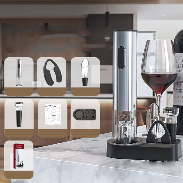 ကျွန်ုပ်တို့၏ Electric Wine Opener Set ဖြင့် အဆင်ပြေစေရန် ဖန်ခွက်ကို မြှင့်လိုက်ပါ ။